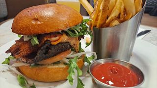 Canadian style Steelhead burger with skin cracklings for crunch.