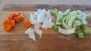 Measure up, before defrosting in water. So that I know how much mirepoix to use (I often have ready made mirepoix in the freezer)