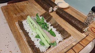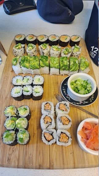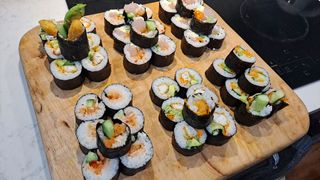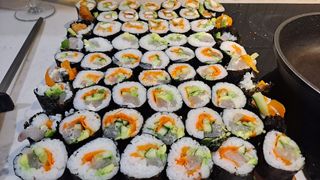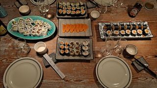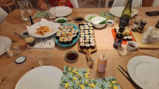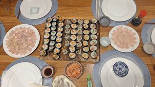 Prep the ingredients and let everyone join in. Back in Sweden, using sashimi grade salmon and Atlantic cod for the fish bits