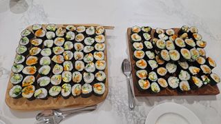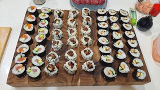 Serving on cutting boards seems to work. Tuna and I think tofu for the vegetarians.