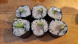 Simple rolls with white fish. The rice looks a day old. Use fresh rice. This is probably leftovers or some simple lunch.