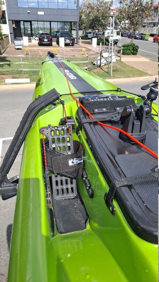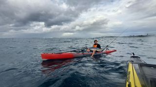 Some people try with a plastic kayak. Those things can work on a good day, but most of the time they'll be stuck on the beach. They're too heavy and clumsy to get through the waves. One in a hundred use a Hobie, but it's limited to the size of the waves it can get through and is also a huge clumsy plastic thing with all the gear on the outside. We use the Ferrari of fishing kayaks because of the waves and also to get some speed when we're trolling. It can be rough out there and you definitely want something that can handle the conditions.